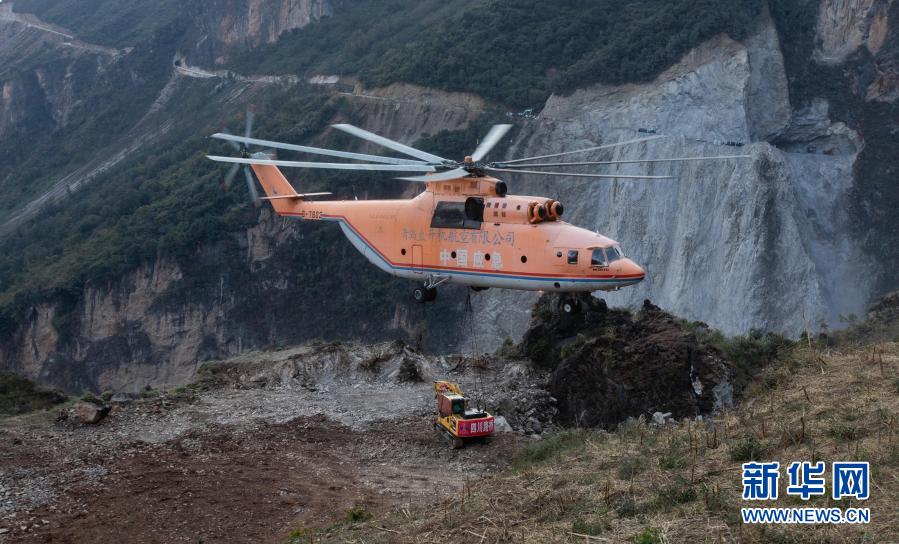 米-26重型直升機(jī)吊運(yùn)一臺挖掘機(jī)抵達(dá)四川省布拖縣阿布洛哈村上空準(zhǔn)備降落(2019年12月5日攝)。為了打通四川省布拖縣阿布洛哈通村公路,施工單位租用的一架米-26重型直升機(jī)克服高山峽谷、天氣多變等不利因素,從布拖縣城吊運(yùn)大型施工設(shè)備到阿布洛哈村,為兩邊分頭掘進(jìn)施工提供大型機(jī)械保障。新華社記者 江宏景 攝