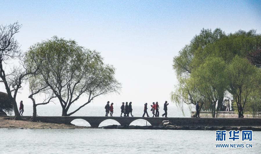 3月13日,游人在江蘇省無錫市太湖黿頭渚景區(qū)游覽。