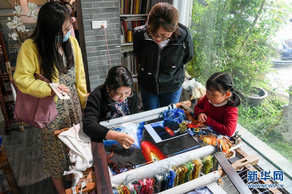 在位于蘇州高新區(qū)鎮(zhèn)湖街道的蘇繡工作室內(nèi),陳英華(右三)為前來參觀的客人展示蘇繡技法(4月14日攝)。新華社記者 李博 攝
