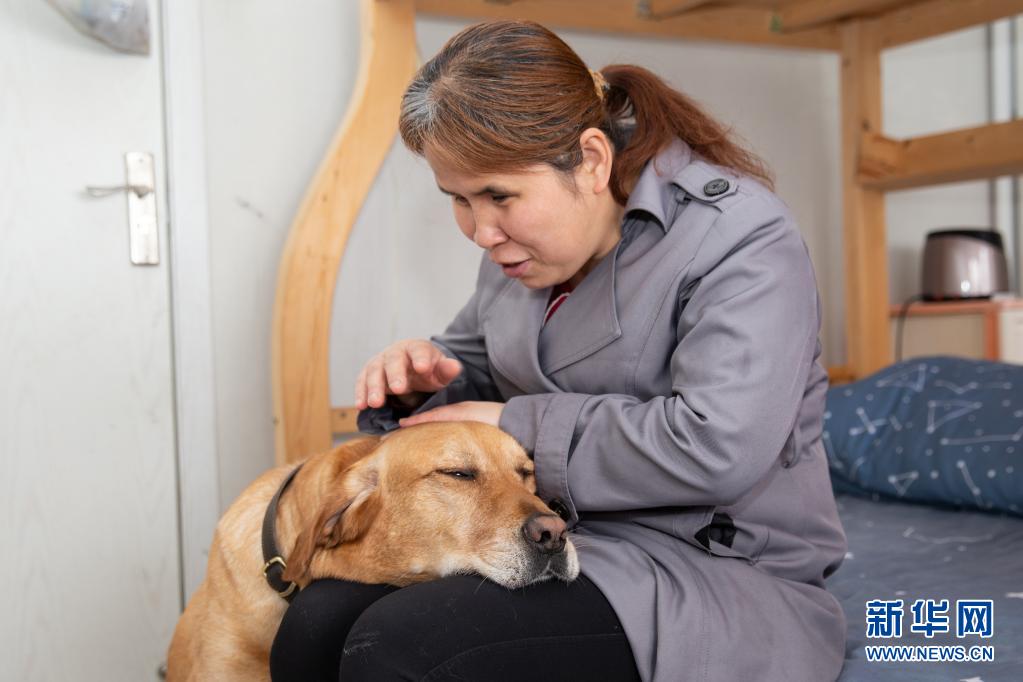 導盲犬“多多”經(jīng)常會把頭放在祝愛葉腿上,祝愛葉一邊撫摸著它的頭一邊和它說說心里話(4月26日攝)。 新華社發(fā) (張夢 攝)