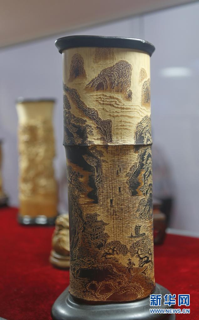 這是5月9日在消博會拍攝的竹雕筆筒。新華社記者 丁洪法 攝