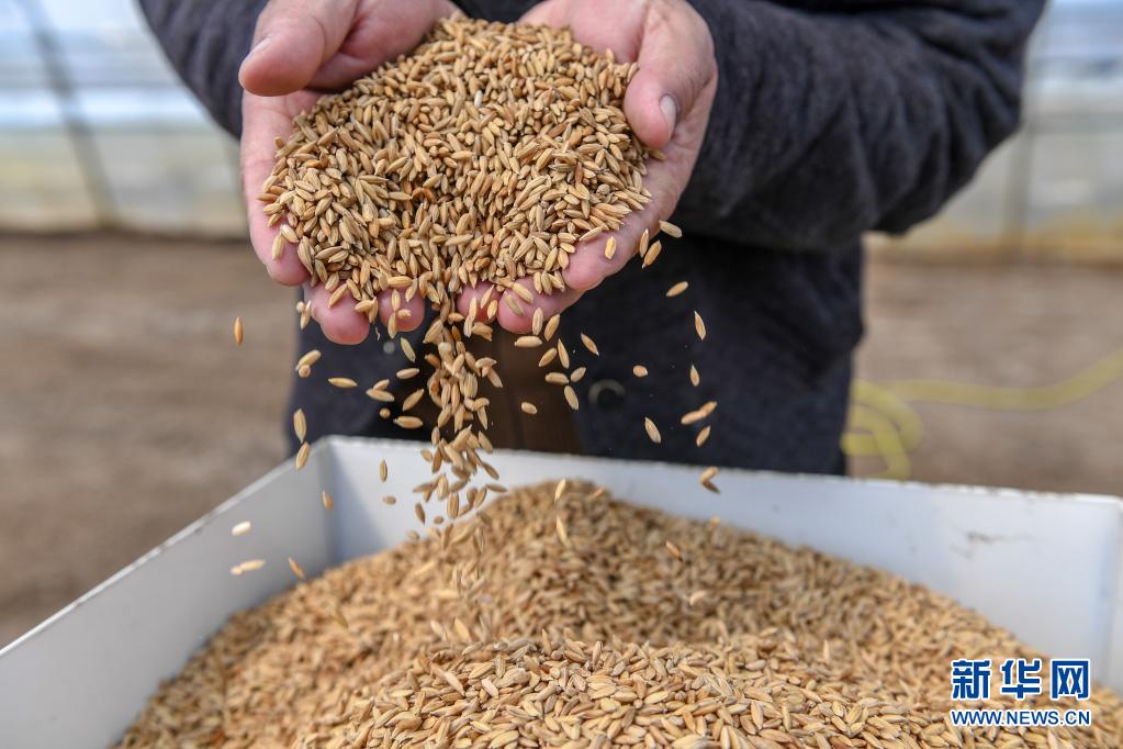 在吉林省吉林市永吉縣九月豐家庭農(nóng)場,負責人肖建波將水稻種子倒入育秧機(4月13日攝)。新華社記者 張楠 攝