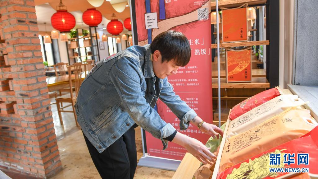 在吉林市船營區(qū)大綏河鎮(zhèn),創(chuàng)業(yè)者曹曦將農(nóng)場生產(chǎn)的大米擺在民宿顯眼位置進行展示(4月20日攝)。新華社記者 張楠 攝