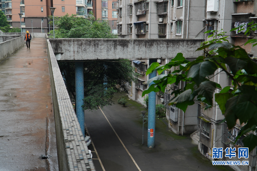 據(jù)了解,該小區(qū)位于重慶市渝中區(qū)長(zhǎng)江二路。通過(guò)這個(gè)空中走廊,居民可以直接走到和天橋齊平的街道上去。新華網(wǎng) 耿駿宇 攝