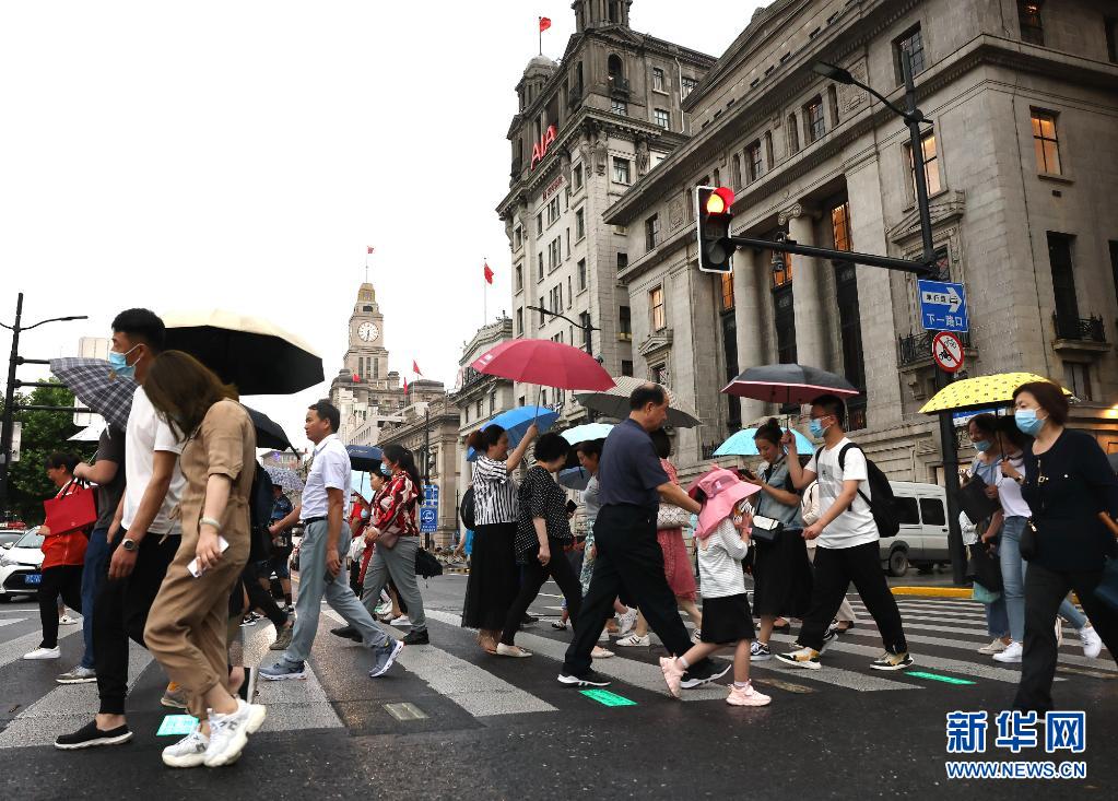 6月10日,游客行走在雨中的上海外灘。