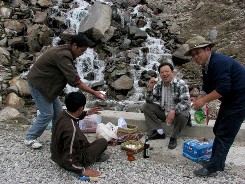 鐘揚(右二)與西藏大學師生在西藏采集種子時在野外用餐。(資料照片)