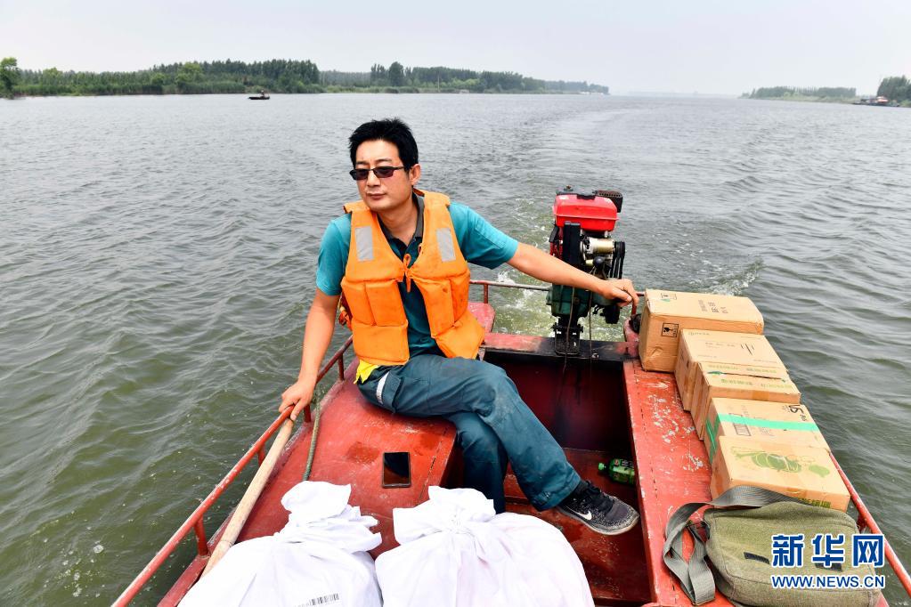 6月20日,在微山縣南陽(yáng)鎮(zhèn),郵遞員王少朋駕駛郵船為村民投遞郵件。