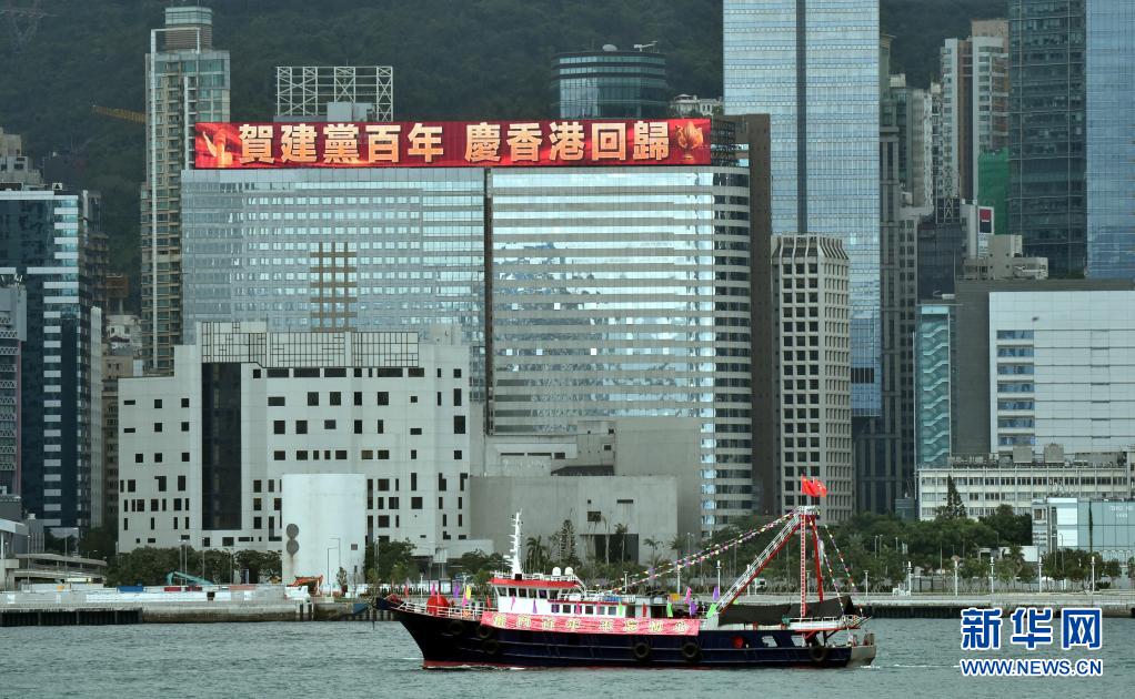 7月1日,懸掛國旗、區(qū)旗的漁船在維港巡游。新華社記者 盧炳輝 攝