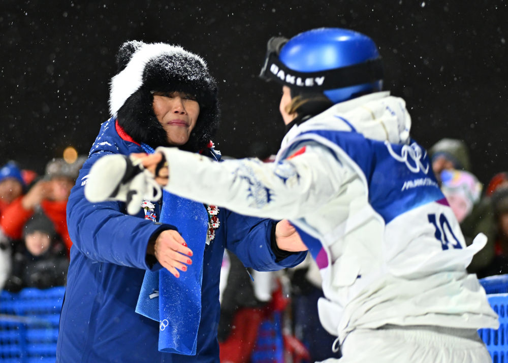 ↑谷爱凌(前)在第三轮比赛后接受祝贺。