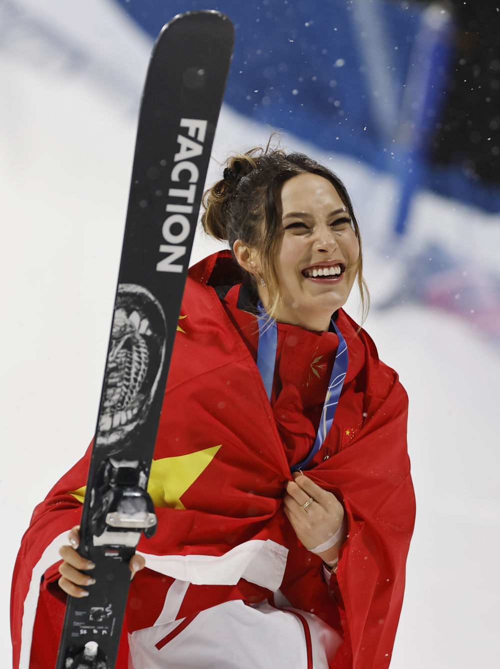 ↑谷爱凌在颁奖仪式后身披国旗庆祝。