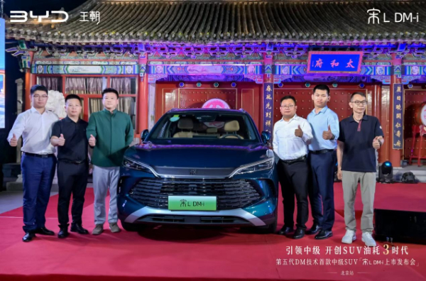 8月12日,比亚迪第五代DM技术首款中级SUV宋L DM-i北京区域上市。作为第五代DM技术首款中级SUV,宋L DM-i百公里亏电油耗低至3.9L,满油满电综合续航超1500km。