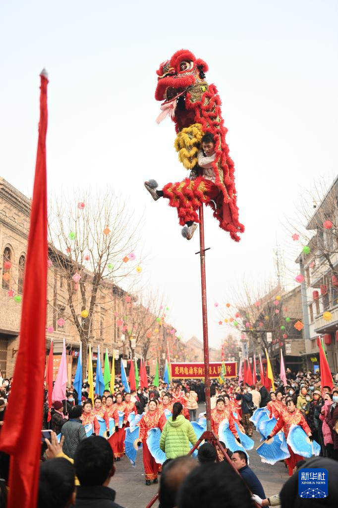 2月6日,社火团队的演员在庙会上表演舞狮(无人机照片)。