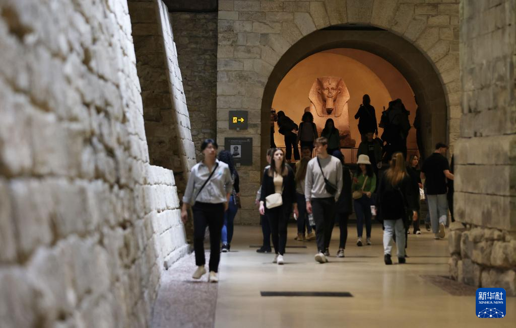 3月22日,在法国巴黎卢浮宫,人们穿过钟阁走进古埃及文物展厅。