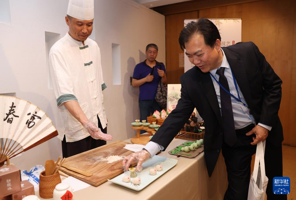 7月11日,在位于法国巴黎的联合国教科文组织总部,南京雨花茶传承人陈盛峰演示制作雨花茶。
