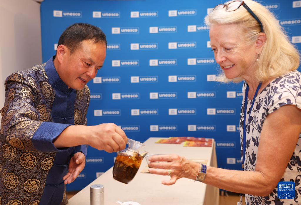 7月11日,在位于法国巴黎的联合国教科文组织总部,嘉宾品尝南京雨花茶。新华社记者 高静 摄