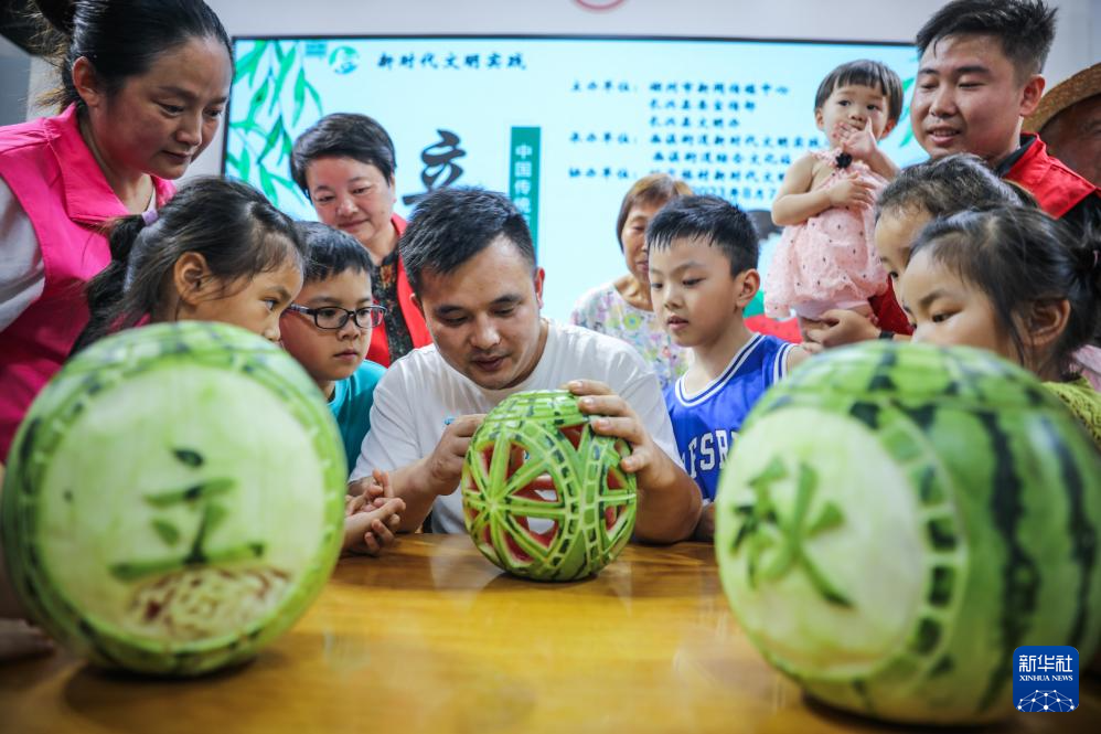 当日,浙江省湖州市长兴县画溪街道在姚家村文化礼堂开展“多彩民俗迎立秋”主题活动,通过“瓜上雕刻”、“啃秋”吃西瓜、悬秤称重等趣味活动,让孩子们体验传统民俗,了解节气的相关知识。