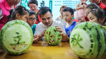 8月8日,在姚家村文化礼堂,非遗传承人在教孩子们“瓜上雕刻”。