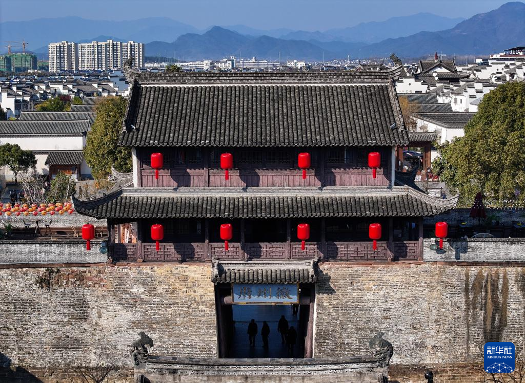 春节临近,安徽省黄山市歙县徽州古城挂起串串大红灯笼,洋溢着喜庆红火的节日氛围。