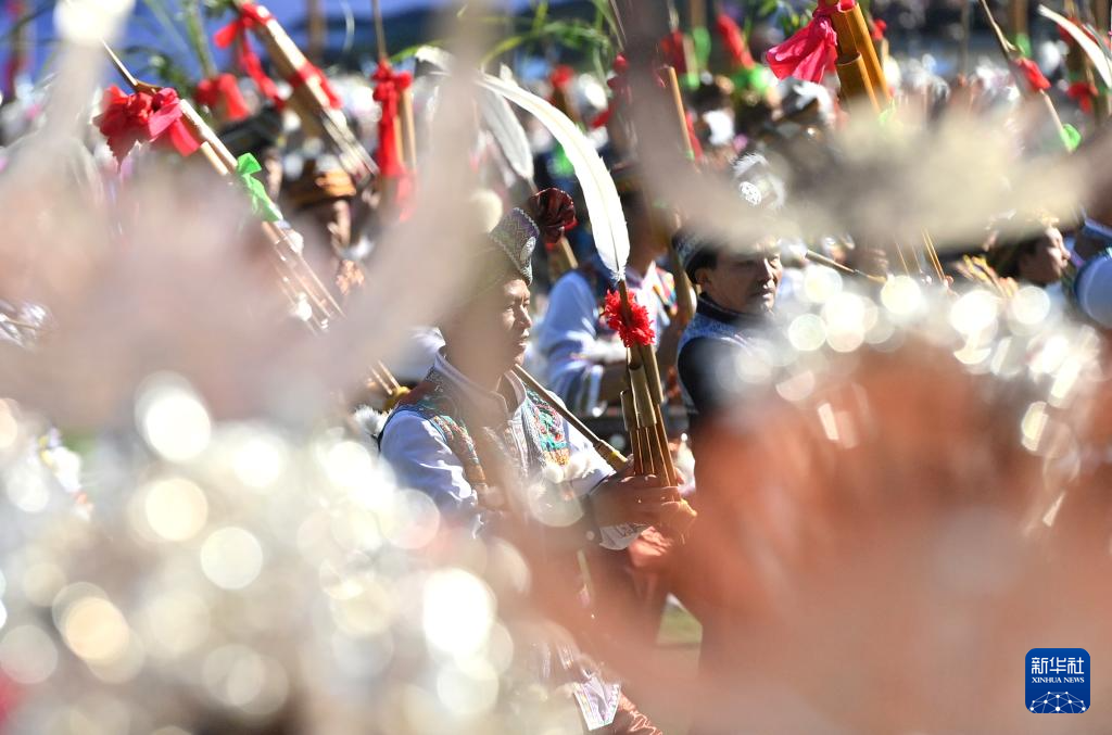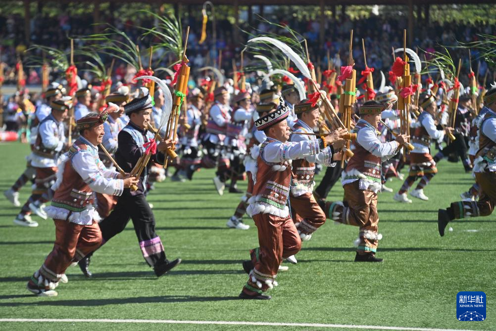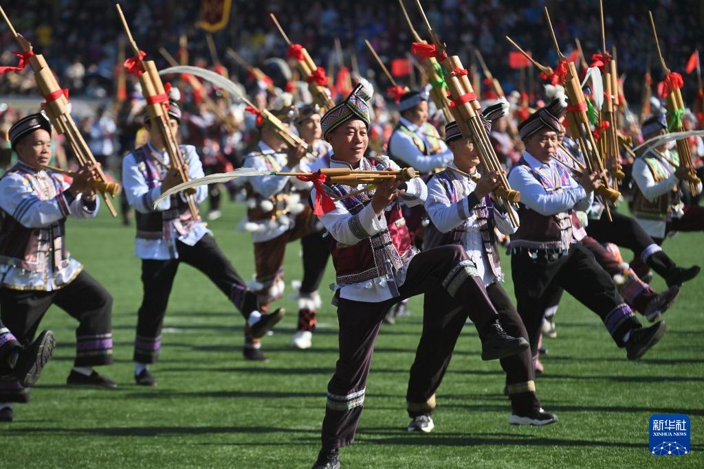 11月29日,表演者在融水县民族体育公园举行的芦笙斗马节开幕式现场吹奏芦笙。