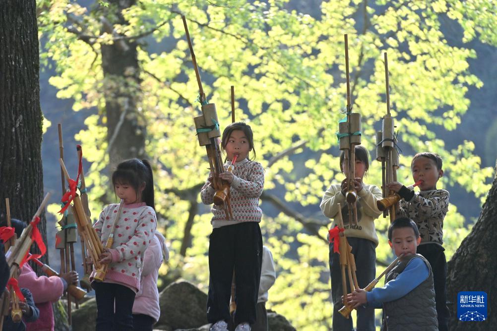 在融水县杆洞乡党鸠村,小学生在“芦笙文化进校园活动”中吹奏芦笙(2025年3月28日摄)。