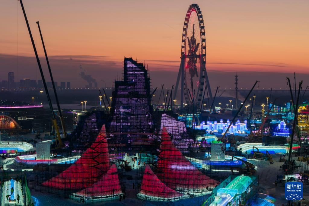 这是12月10日拍摄的哈尔滨冰雪大世界主塔施工现场(无人机照片)。