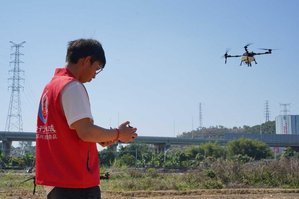 志愿服务队员操作农用无人机进行飞播作业,田间地头显身手