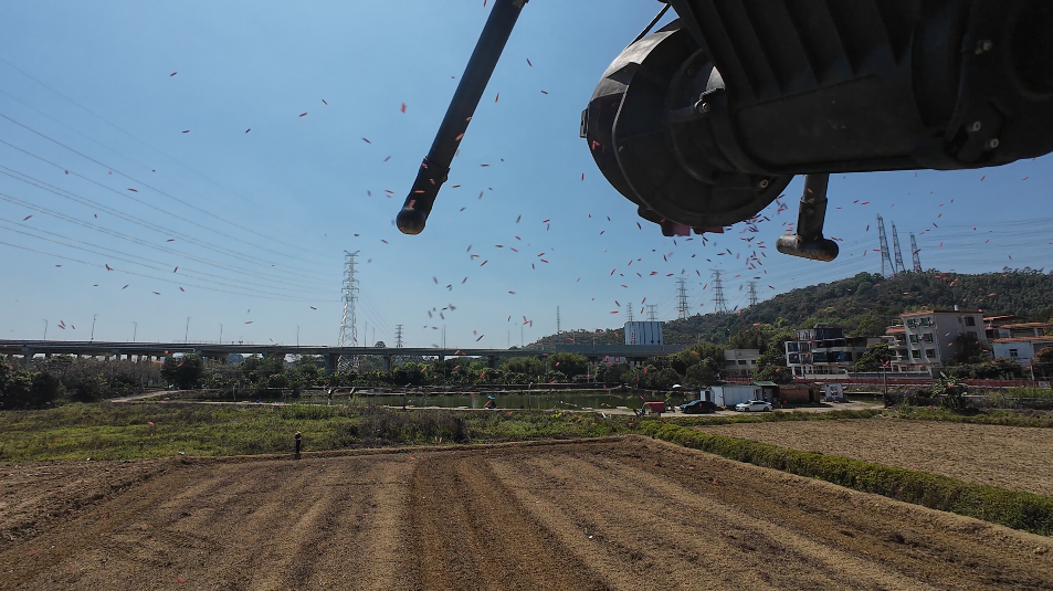 农用植保无人机正在进行丝苗米飞播作业