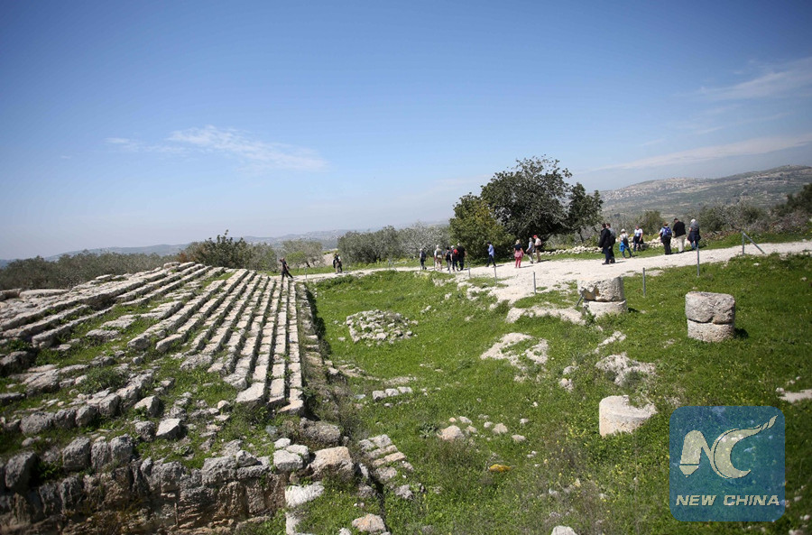 Palestinians seen during their visit to the Roman historical site of Sebastia village, north of the West Bank city of Nablus, on March 22, 2017. (Xnihua photo)