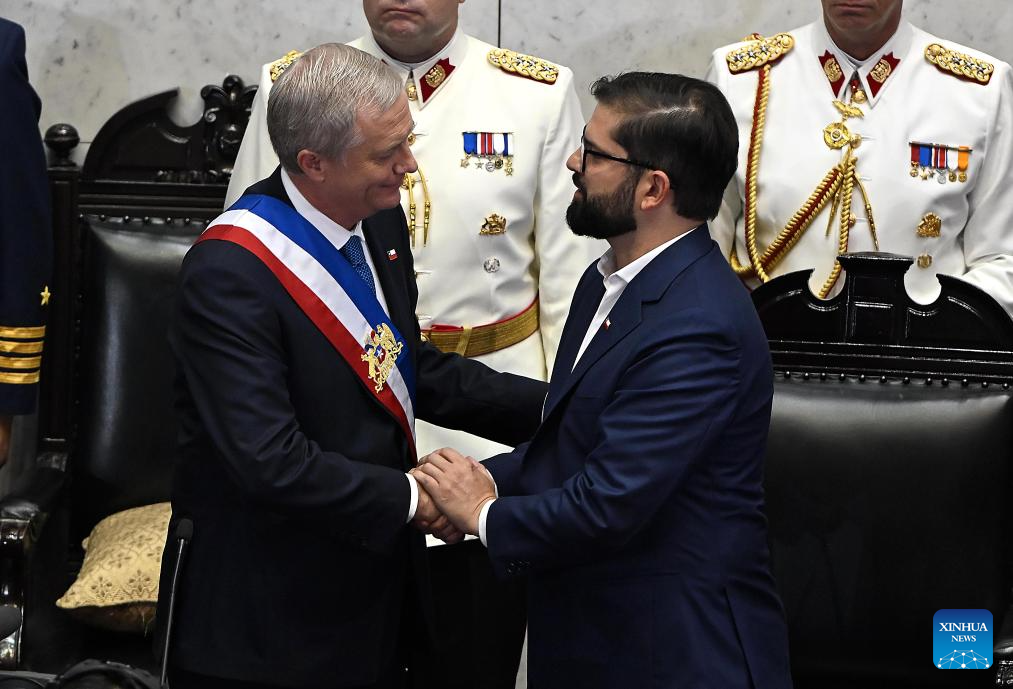 Chile's new president Jose Antonio Kast (L) shakes hands with former President Gabriel Boric during the inauguration ceremony at the National Congress in Valparaiso, Chile, March 11, 2026. Kast took office on Wednesday as Chile's new president for the 2026-2030 term, succeeding Gabriel Boric. (Agencia UNO/Handout via Xinhua)