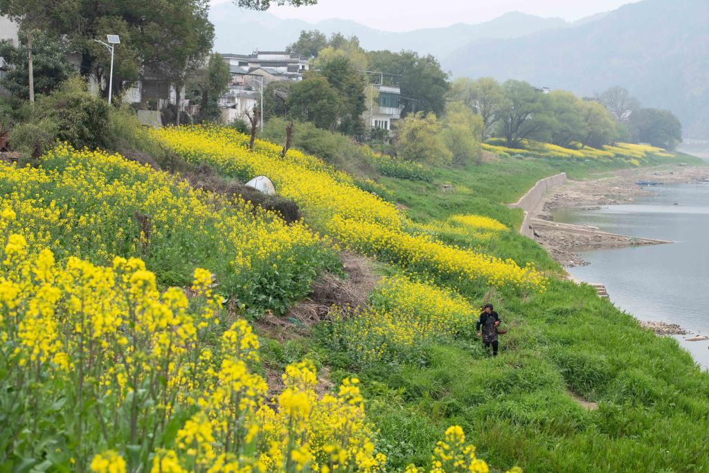 SHEXIAN, March 18 (Xinhua) -- As spring unfolds, rapeseed flowers along the Xin'an River, a bio-diverse waterway which flows from Anhui to Zhejiang, have entered blooming season.