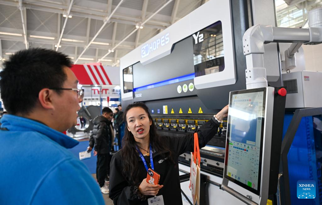 An exhibitor introduces an equipment to a visitor at the 22nd China (Tianjin) International Equipment & Manufacturing Industry Expo (CIEX) in north China's Tianjin, March 18, 2026. The four-day expo kicked off here on Wednesday, attracting over 800 enterprises from home and abroad to participate. (Xinhua/Sun Fanyue)