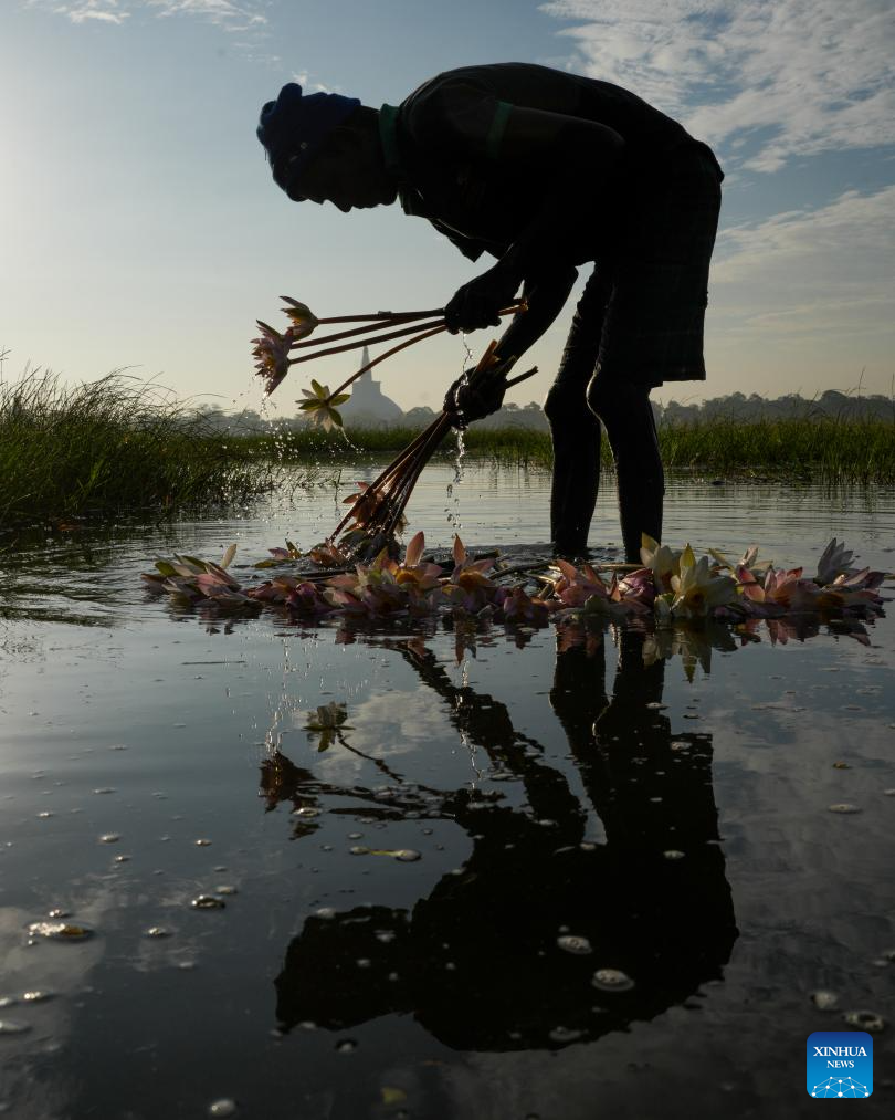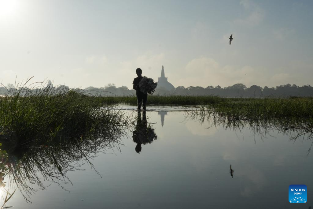 A local picks flowers from a lake in Anuradhapura, Sri Lanka, March 15, 2026. In 1982, the Sacred City of Anuradhapura was inscribed as a United Nations Educational, Scientific and Cultural Organization World Heritage Site. (Photo by Thilina Kaluthotage/Xinhua)