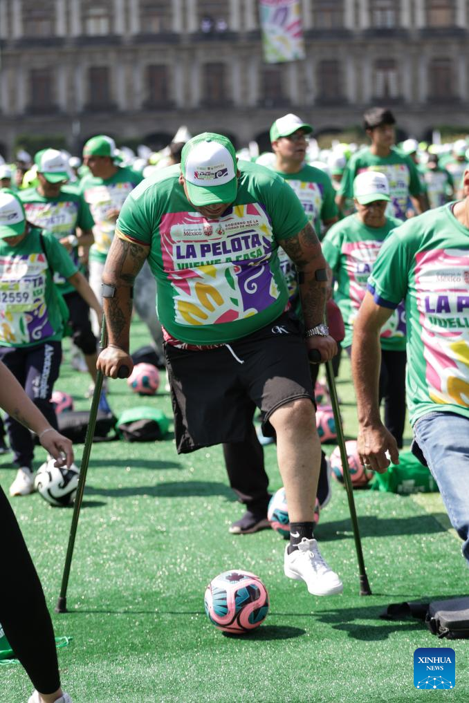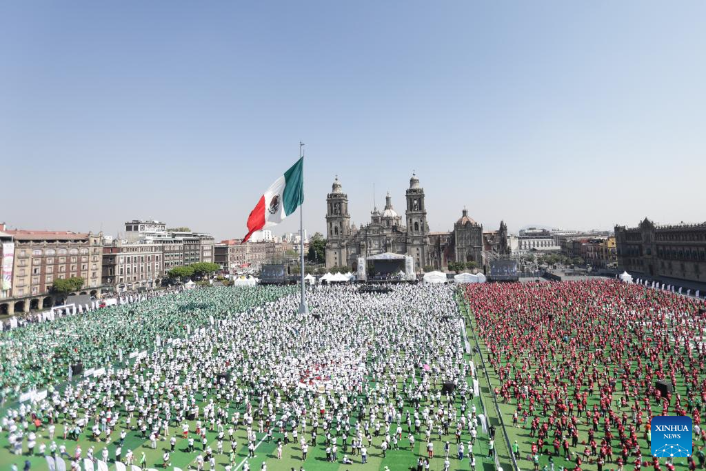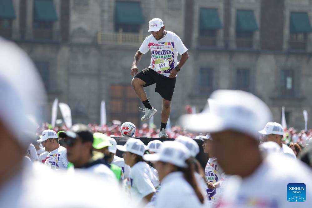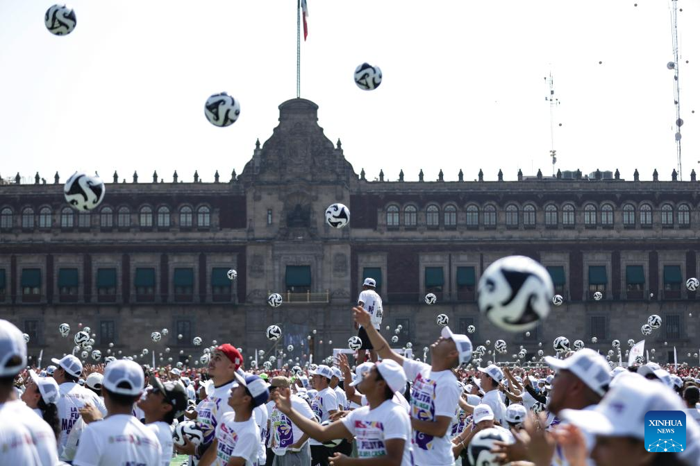 People take part in the largest football lesson in the world held at the Zocalo in Mexico City, capital of Mexico, on March 15, 2026. Mexico City on Sunday secured the Guinness world record for the largest football class in the world. (Photo by Francisco Canedo/Xinhua)
