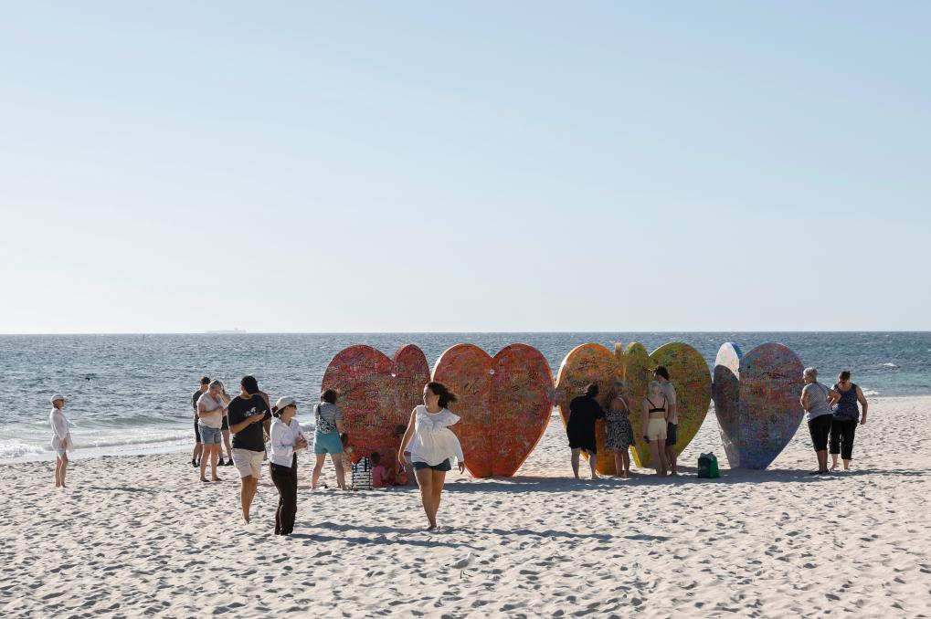 3月16日,人们在澳大利亚珀斯“海滨雕塑展”的展品上写下心愿。