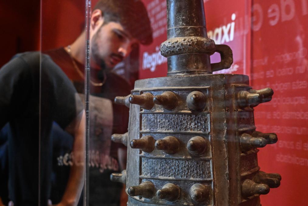 3月17日,在西班牙瓜达拉哈拉博物馆,一名男子参观中国西南地区青铜文明展上来自贵州的展品铜甬钟。