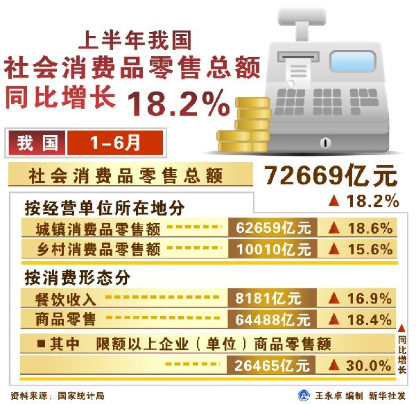 圖表:上半年我國(guó)社會(huì)消費(fèi)品零售總額增長(zhǎng)18.2%