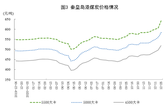 港口煤炭綜合交易價格上漲。12月25日,秦皇島港5500大卡、5000大卡和4500大卡動力煤綜合交易價格分別為每噸642元、583元和519元,比11月27日分別上漲56元、50元和45元。