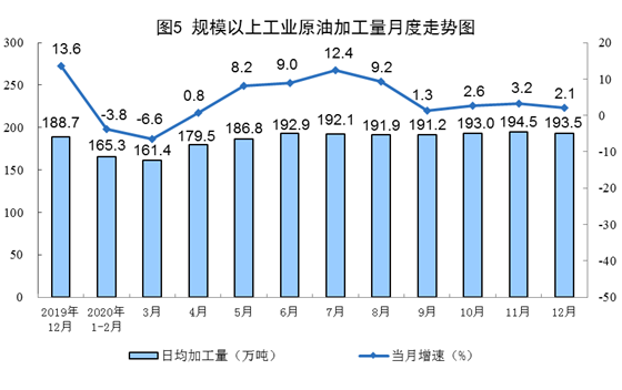 原油生產(chǎn)增速略有放緩。12月份,生產(chǎn)原油1627萬噸,同比增長0.9%,增速比上月回落0.3個百分點;日產(chǎn)52.5萬噸,環(huán)比減少0.7萬噸。加工原油6000萬噸,同比增長2.1%,比上月回落1.1個百分點。2020年,生產(chǎn)原油1.95億噸,比上年增長1.6%;加工原油6.7億噸,增長3.0%。