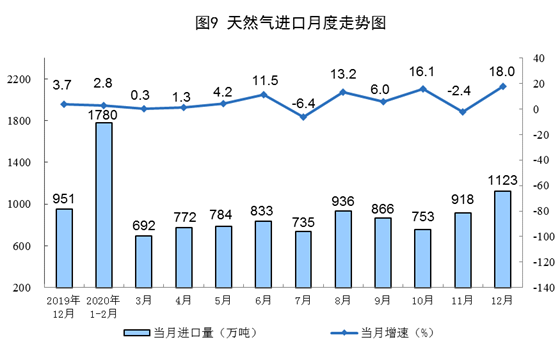 天然氣進口由降轉增。12月份,進口天然氣1123萬噸,同比增長18.0%,上月為下降2.4%。2020年,進口天然氣1.02億噸,比上年增長5.3%。