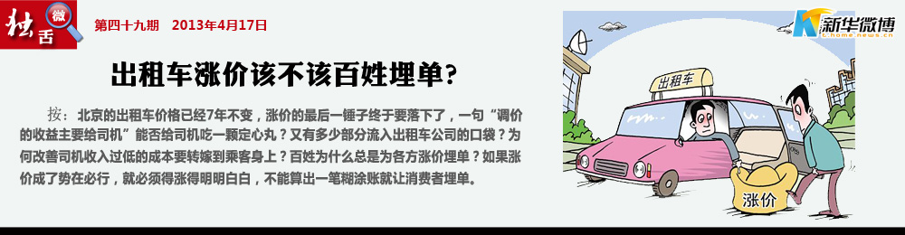 一粬:需考慮全國人民的感受 反對出粗車漲價,北京出租車漲價的理由居然是根據(jù)北京居民和工薪階層工資上漲幅度為理由,確實是特權(quán)利益階層短視經(jīng)不起推敲的謬見,北京是全體國家公民一生中最少去一次的城市,所有窗口行業(yè)的收費確實不只是一個城市的小事情,須思考全國人民的感受。