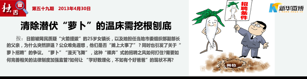 拔“蘿卜”更需祛“污泥” 對曝光的類似事件不能僅僅停留在“補改撤銷”的層面,更多的是對?!疤貦?quán)”、打“親情牌”、用公權(quán)辦私事者的嚴(yán)格問責(zé),杜絕補改、撤銷招聘淪為一些人的免責(zé)“擋箭牌”,發(fā)現(xiàn)一起、查處一起。