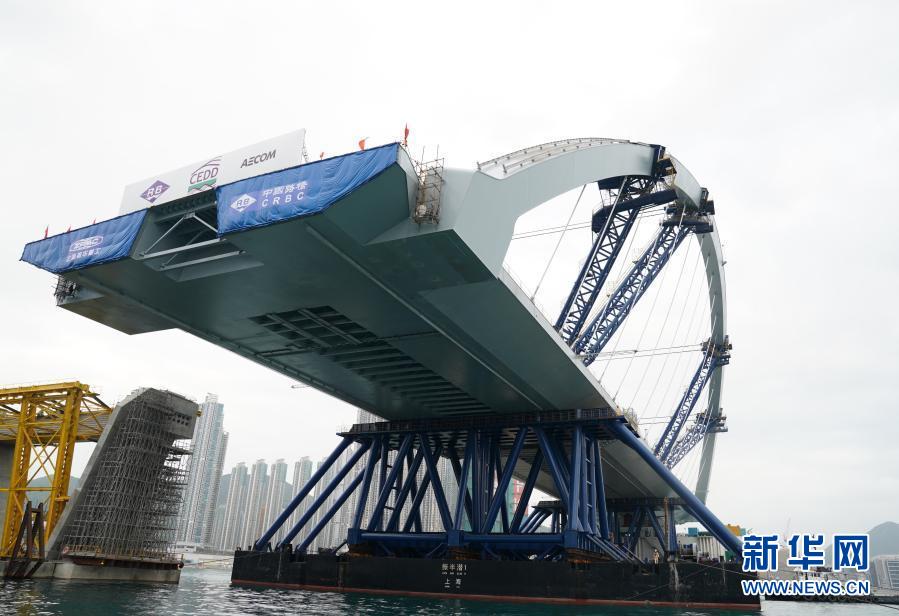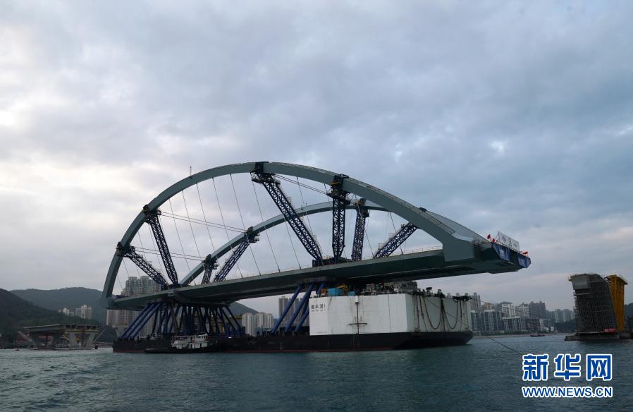 2月26日,將軍澳跨灣大橋主橋順利完成浮托安裝,浮托安裝總重達12000噸,總長214米,創(chuàng)造國內(nèi)單體拱橋整體安裝的新紀錄。