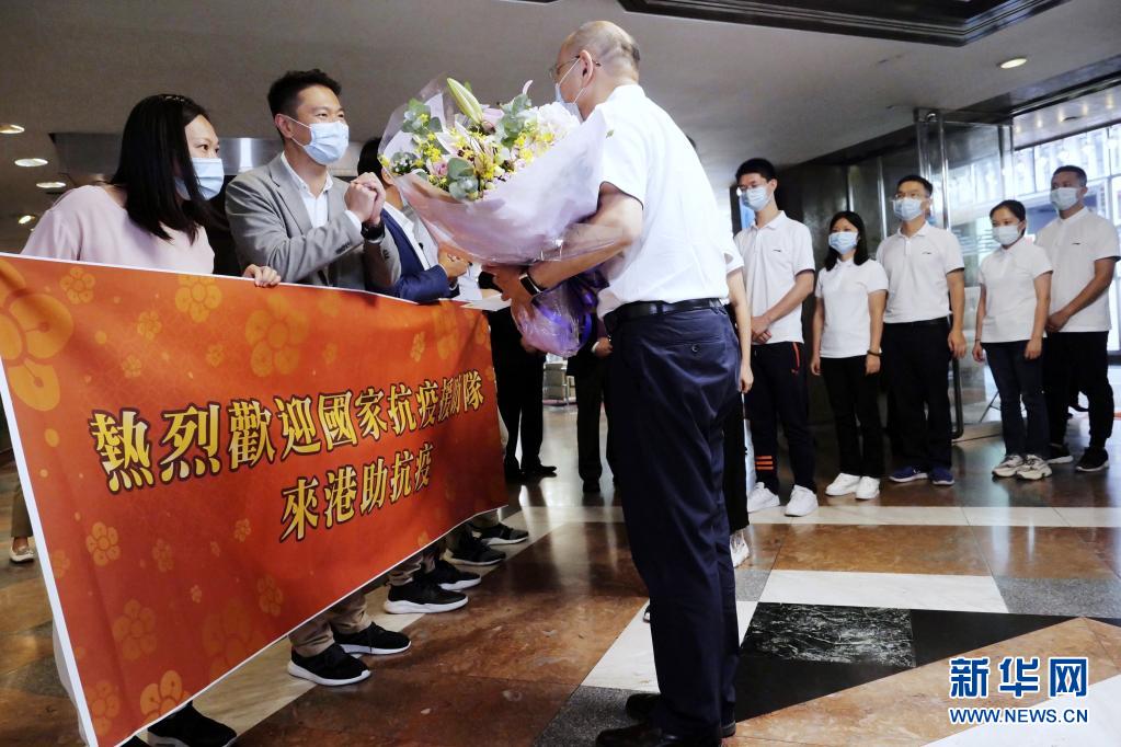 香港市民代表在香港九龍維景酒店歡迎內(nèi)地核酸檢測(cè)支援隊(duì)抵港(2020年8月21日攝)。新華社記者 王申 攝