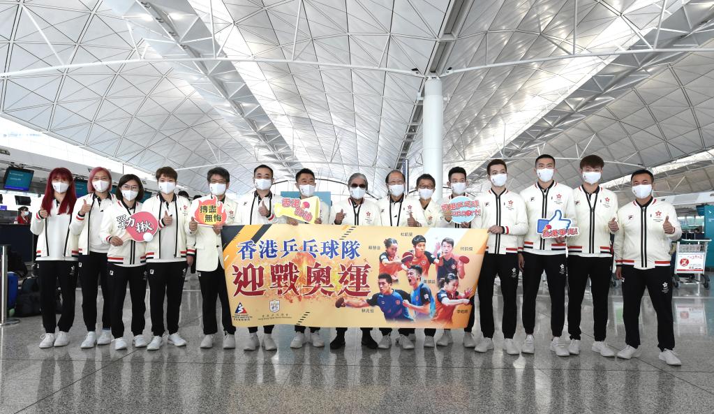 7月17日,中國(guó)香港體育協(xié)會(huì)暨奧林匹克委員會(huì)會(huì)長(zhǎng)霍震霆(中)、中國(guó)香港代表團(tuán)團(tuán)長(zhǎng)貝鈞奇(右七)與中國(guó)香港乒乓球隊(duì)教練及運(yùn)動(dòng)員合影。當(dāng)日,中國(guó)香港代表團(tuán)從香港國(guó)際機(jī)場(chǎng)出發(fā)參加?xùn)|京奧運(yùn)會(huì)。據(jù)悉,中國(guó)香港代表團(tuán)將有46名運(yùn)動(dòng)員參加?xùn)|京奧運(yùn)會(huì)38個(gè)小項(xiàng)的爭(zhēng)奪。新華社記者盧炳輝攝