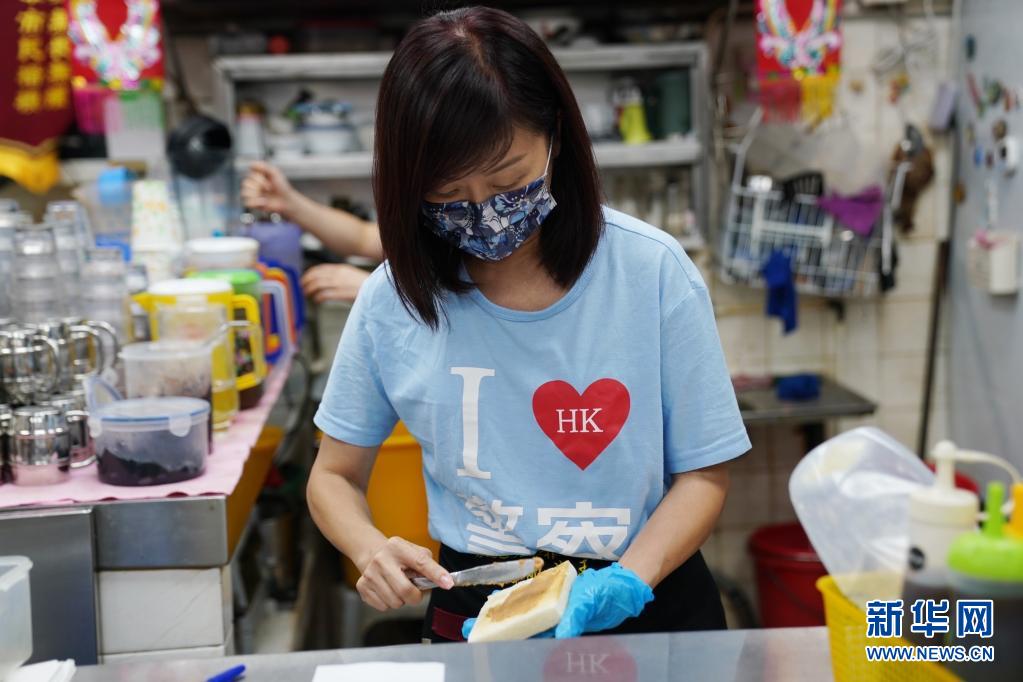 在香港鯉魚門“銀龍咖啡茶座”餐廳,女老板李凱瑚在為客人制作餐食(7月26日攝)。新華社記者 王申 攝