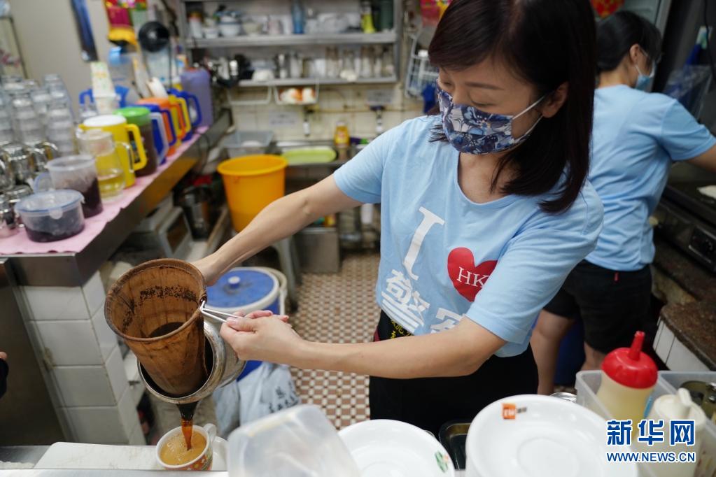 在香港鯉魚門“銀龍咖啡茶座”餐廳,女老板李凱瑚在為客人制作招牌奶茶(7月26日攝)。 新華社記者 王申 攝