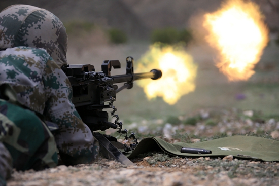 2016年4月25日,西部戰(zhàn)區(qū)陸軍某團機槍連官兵攜帶重機槍對“敵”目標實施火力打擊。視覺中國供圖(資料圖片)