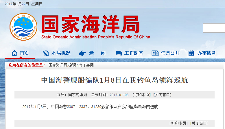 新華網(wǎng)北京2月18日電 據(jù)國家海洋局網(wǎng)站報(bào)道,2017年2月18日,中國海警2401、2337、2101、2106艦船編隊(duì)在我釣魚島領(lǐng)海內(nèi)巡航。