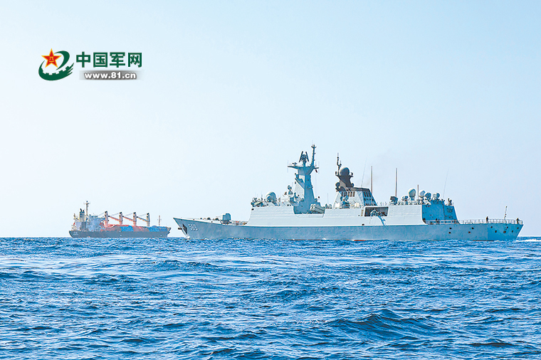 OS35號貨船在玉林艦的護(hù)送下向也門亞丁港附近海域航行。李維攝