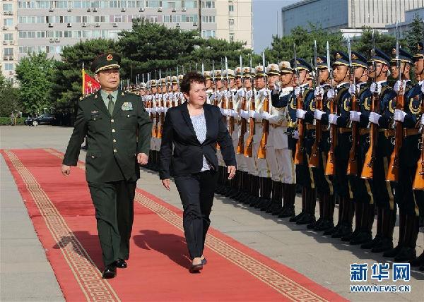 5月16日,國務(wù)委員兼國防部長常萬全在北京與波斯尼亞和黑塞哥維那國防部長瑪麗娜·彭黛什舉行會(huì)談。會(huì)談前,常萬全為彭黛什舉行歡迎儀式并陪同檢閱中國人民解放軍三軍儀仗隊(duì)。新華社記者 劉芳 攝